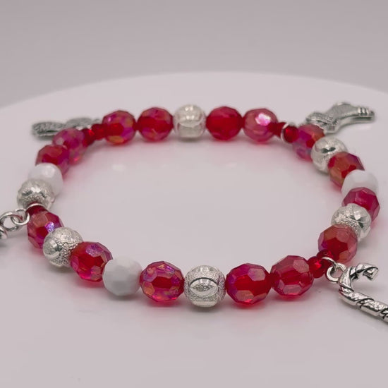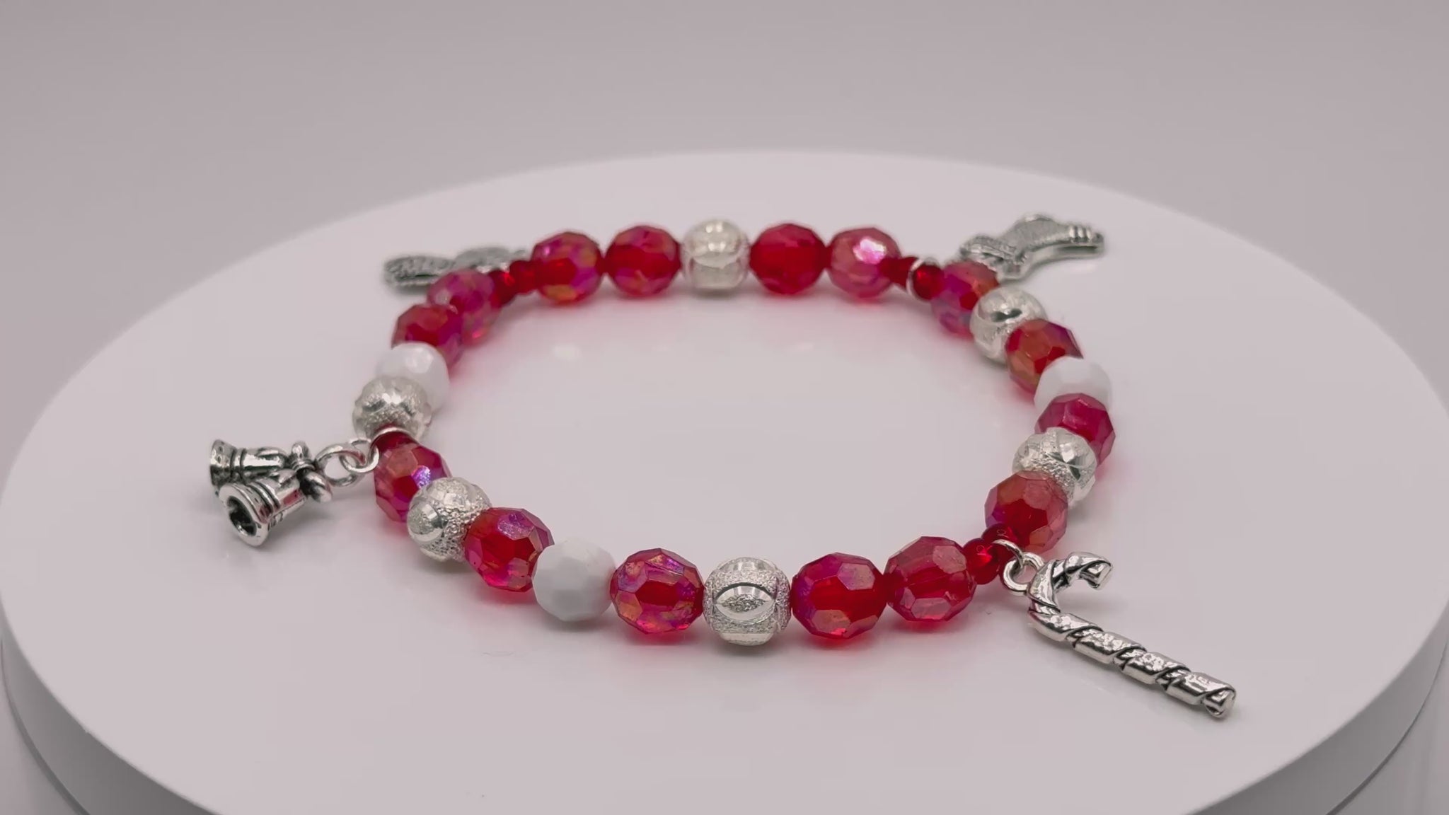 Inspired by snowy nights and warm firesides, this stretch bracelet mixes frosty white, holly red, and silver charms for the perfect cozy holiday look.