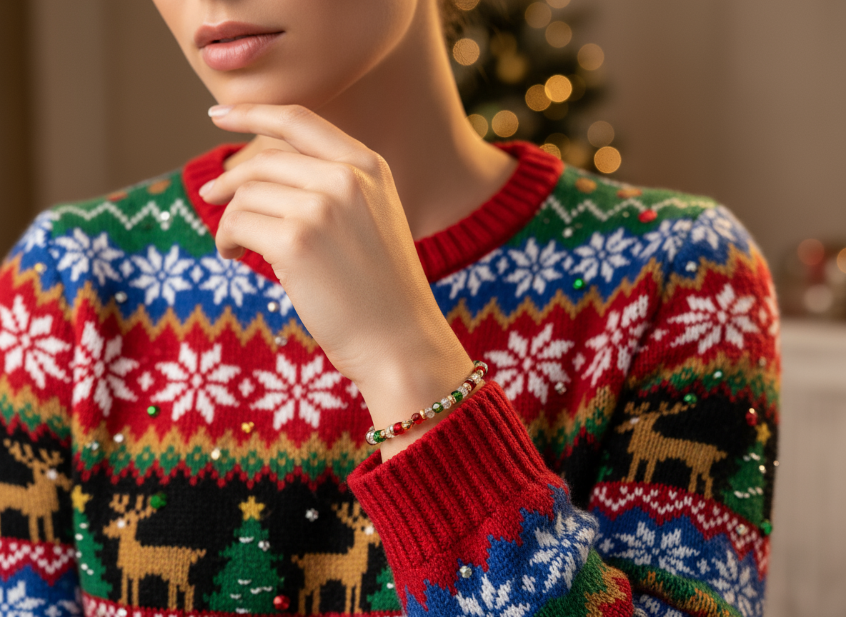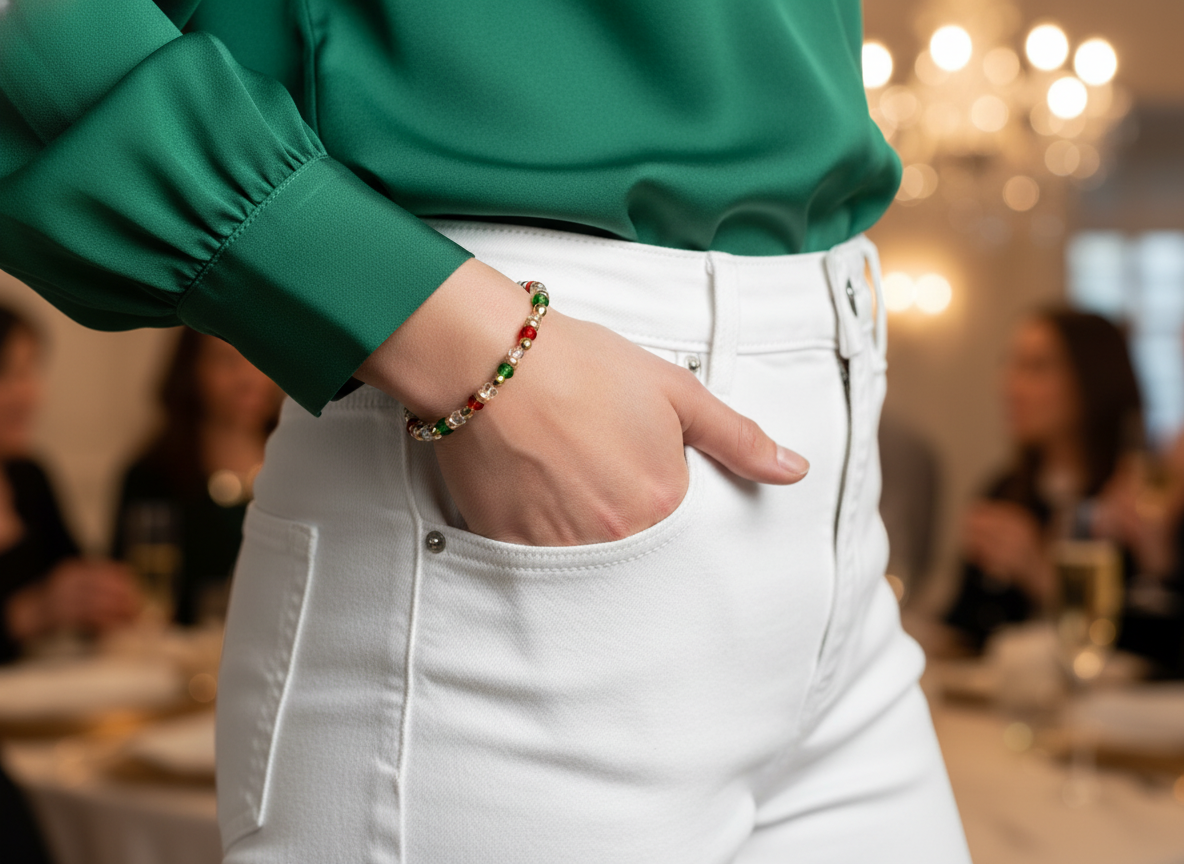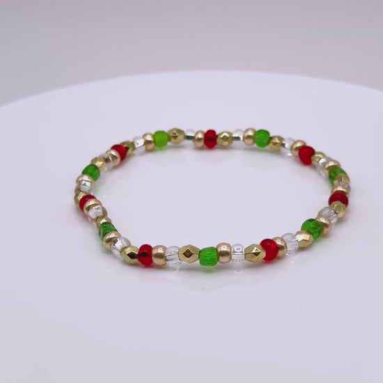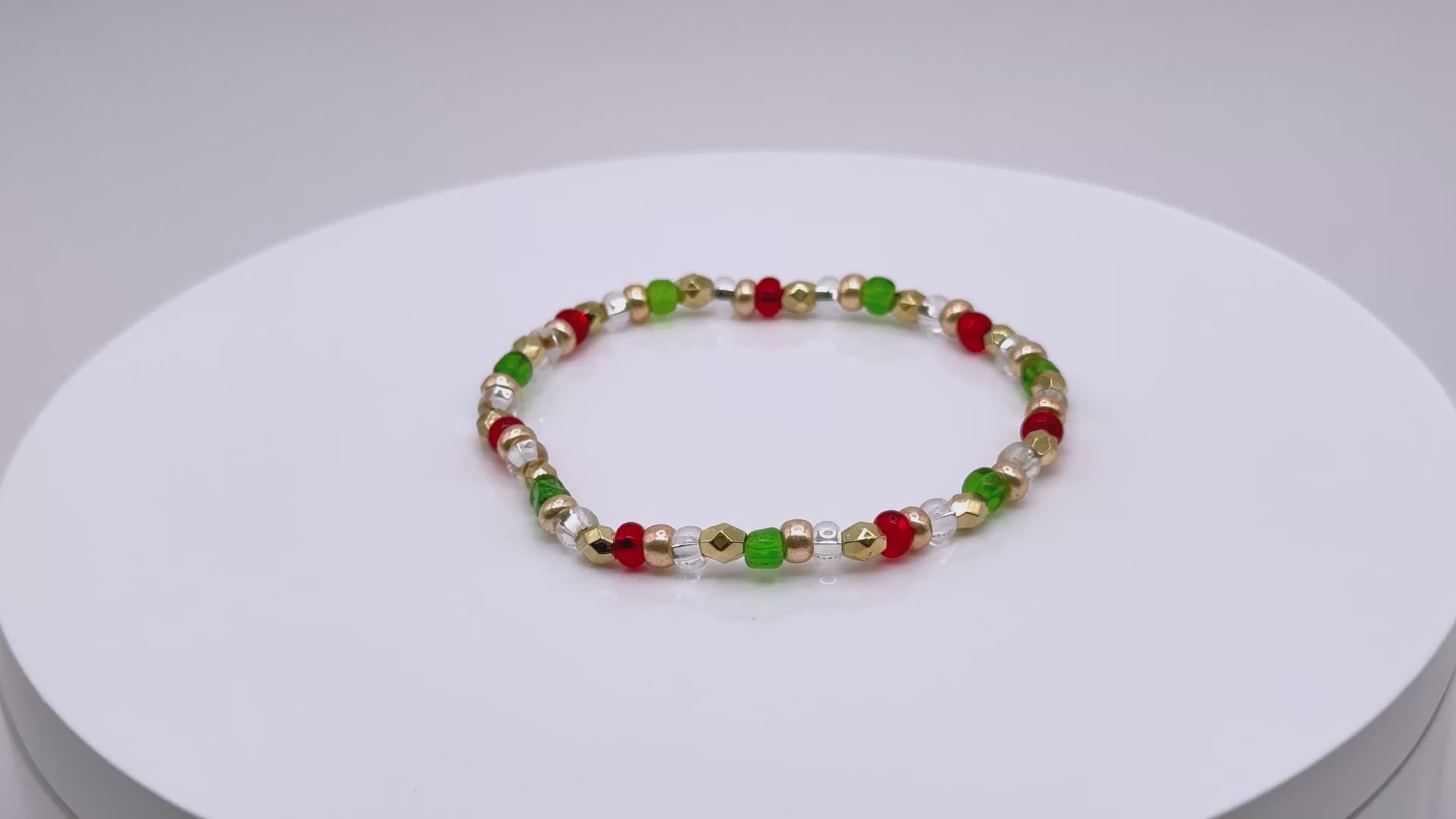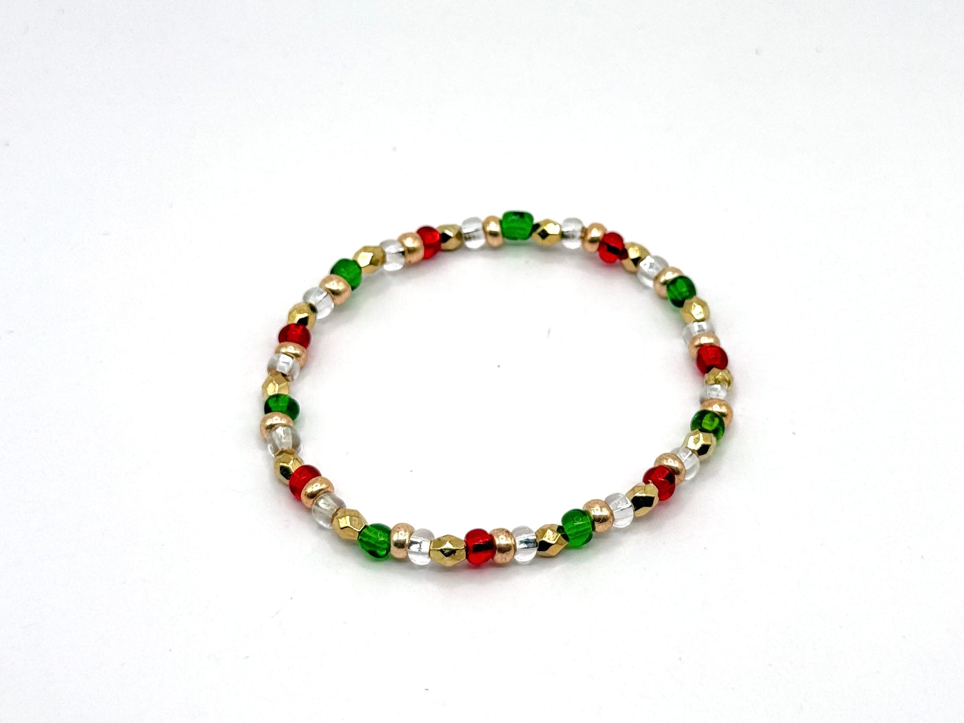 This playful stretch bracelet is bursting with color — a cheerful mix of red, green, gold, and clear beads that look like confetti from Santa’s workshop!