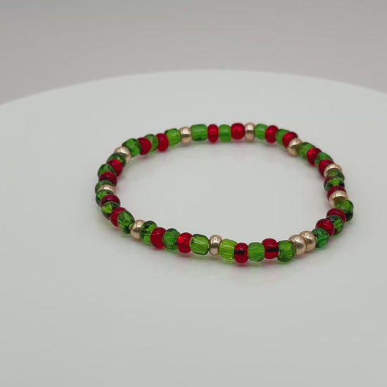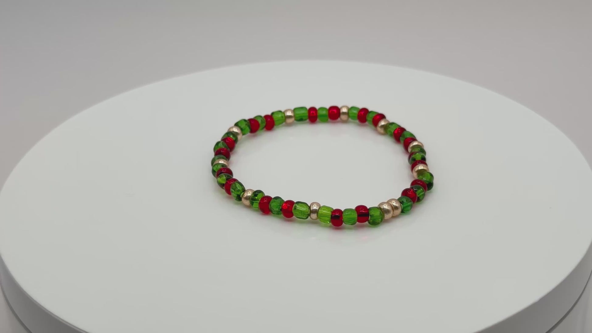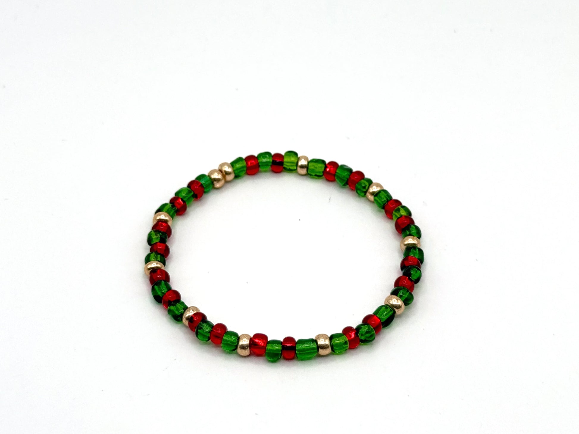 Straight from the North Pole! This stretch bracelet mixes red and green beads with a touch of gold for that signature elf sparkle. Whimsical, bright, and full of Christmas fun.