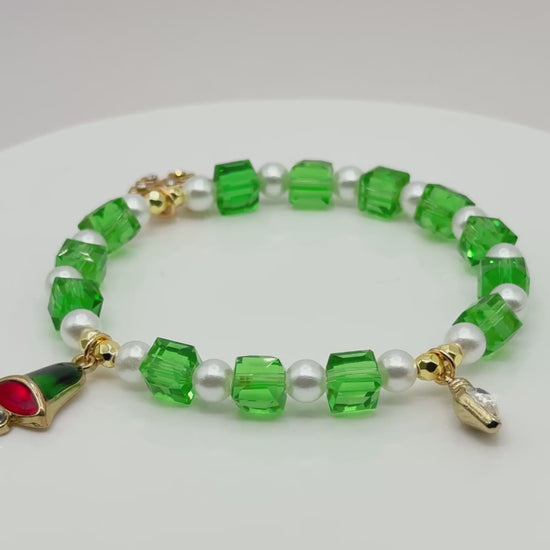 Whimsical green gems and glimmering gold accents make this playful stretch bracelet feel like it was handmade by Santa’s most stylish elf.
