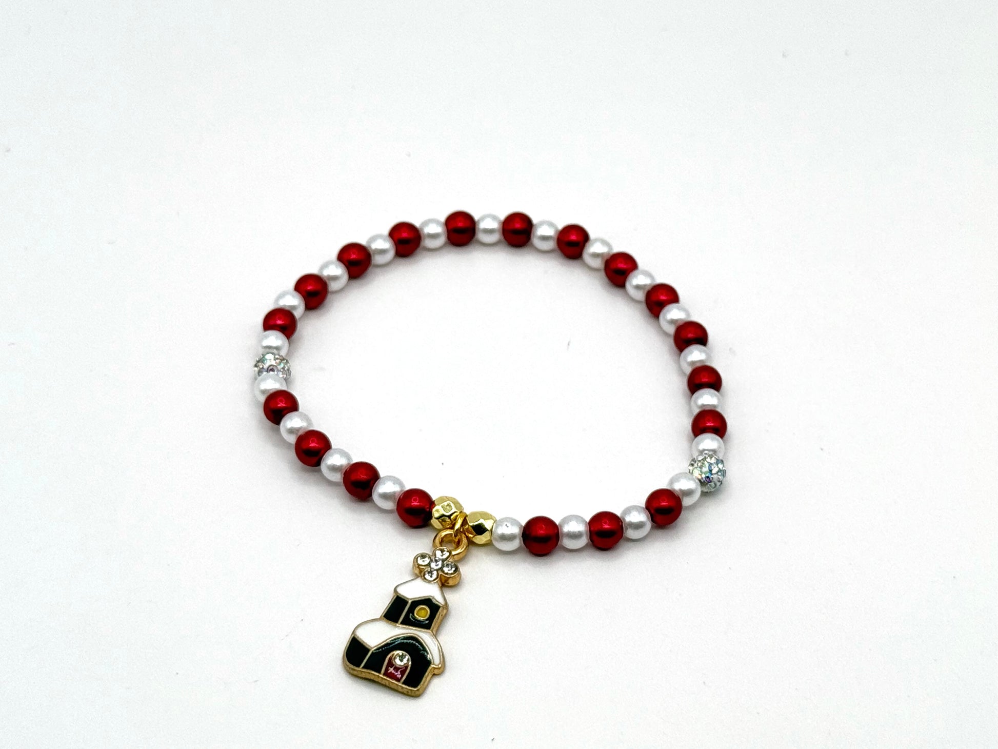 Elegant and heartfelt, this stretch bracelet blends holiday shimmer with a church charm that symbolizes love and hope through the season. A lovely piece to wear or gift with intention.