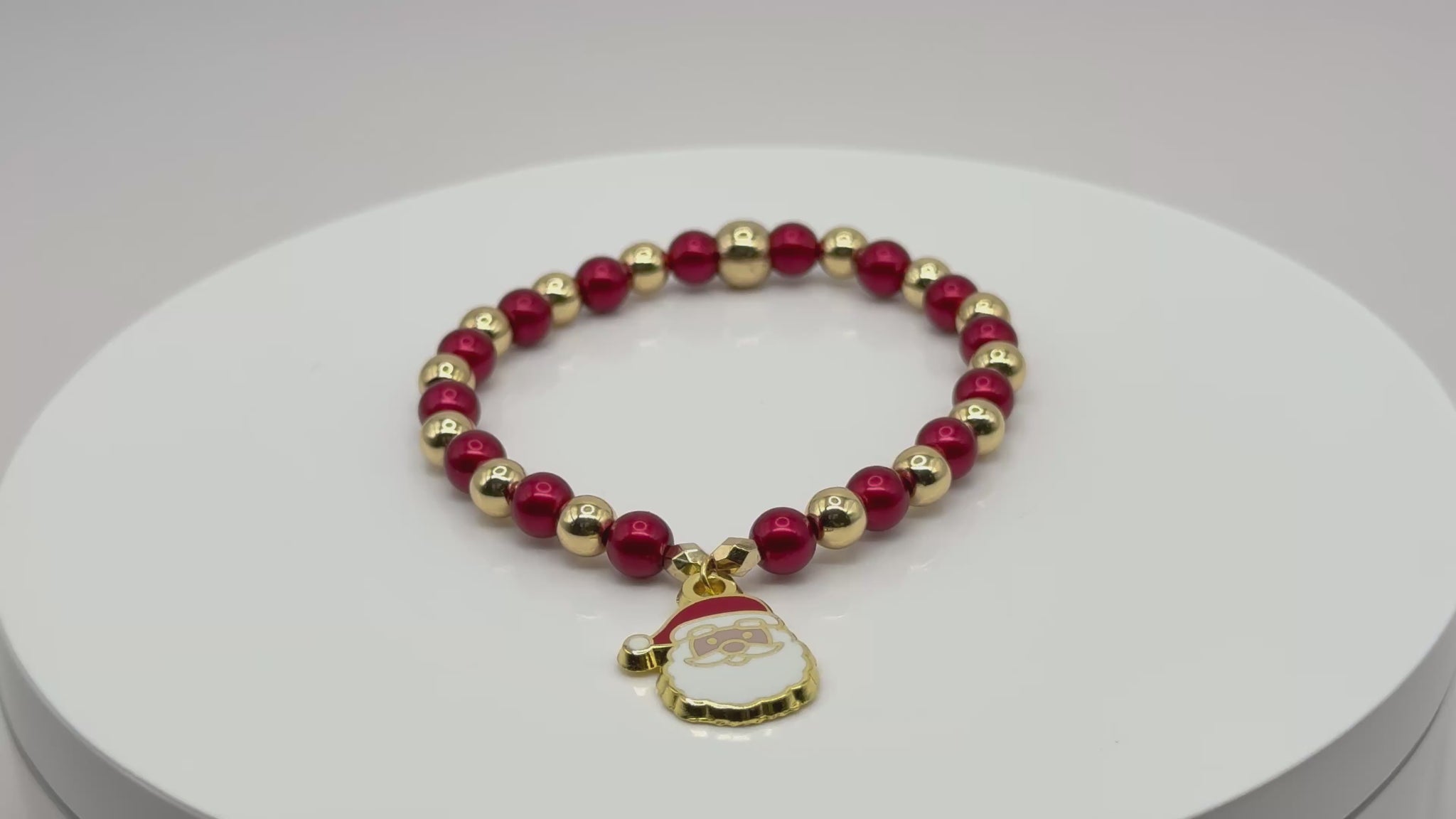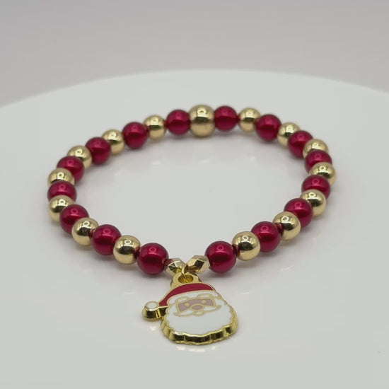 Classic Christmas tones and a golden Santa charm make this stretch bracelet a merry little piece of wearable holiday cheer.