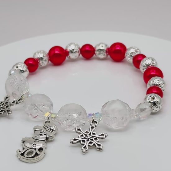 This merry stretch bracelet mixes shimmering snowflake charms, red sparkle, and a joyful snowman to capture the spirit of a snowy Christmas morning.
