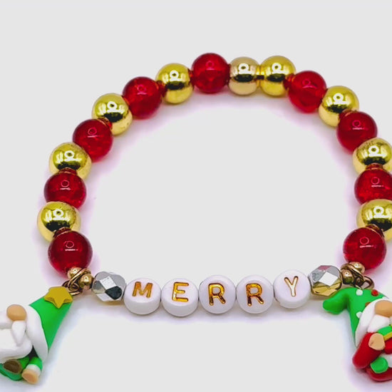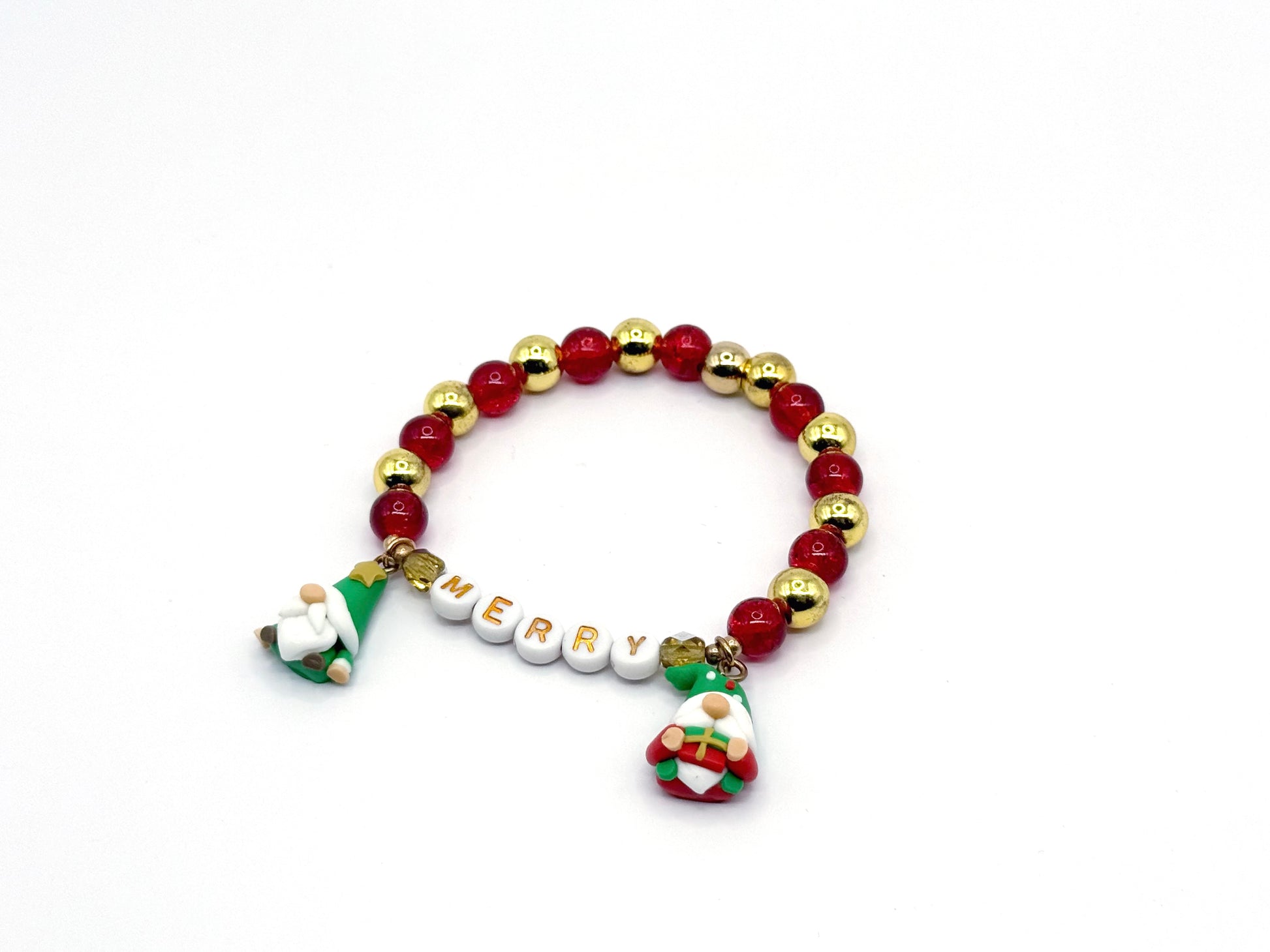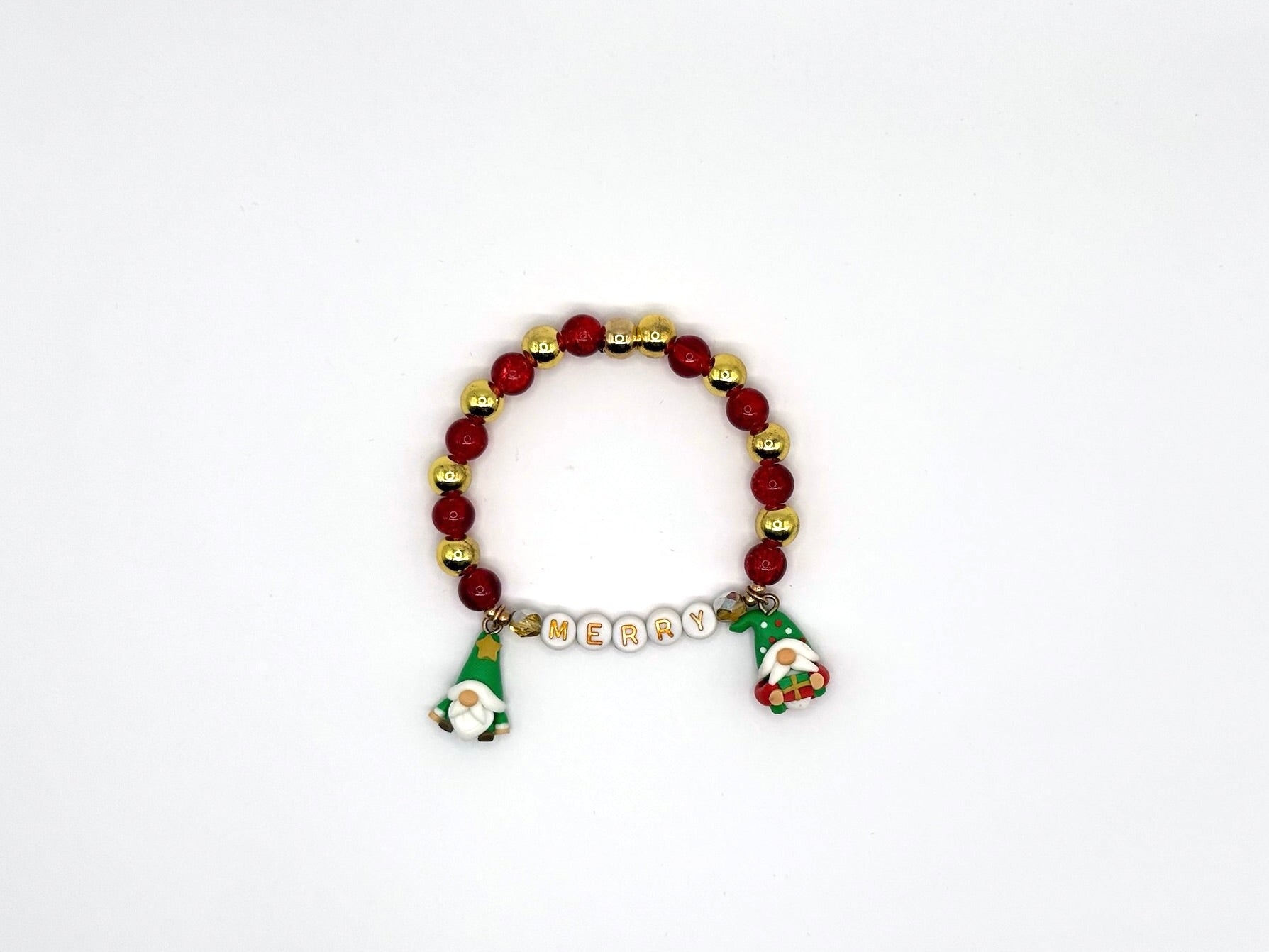 Festive, charming, and full of character, this bracelet pairs merry red and gold beads with a duo of delightful gnomes spreading Christmas cheer.