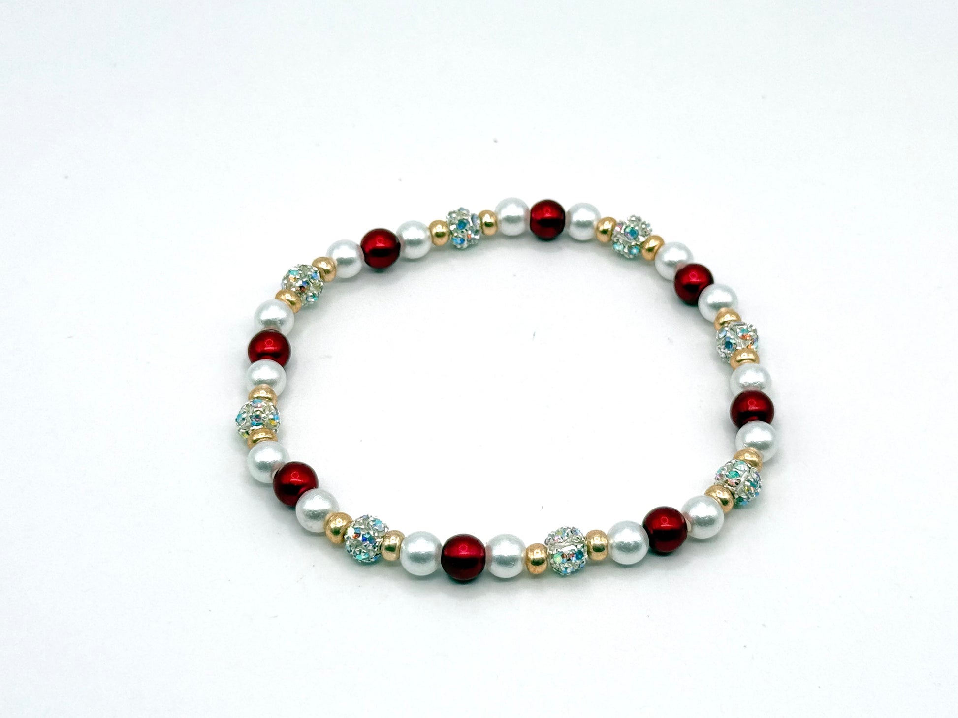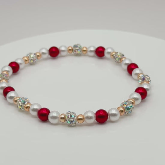 Red, pearl, and gold shimmer in perfect harmony — a stretch bracelet that captures the glow of the season’s most magical moments.