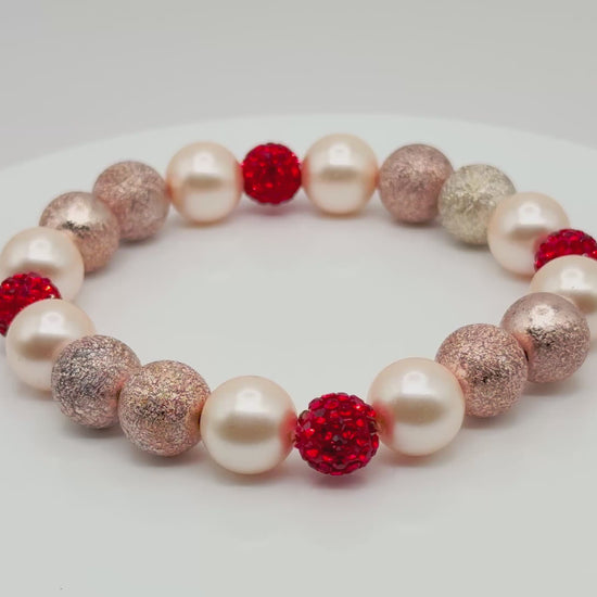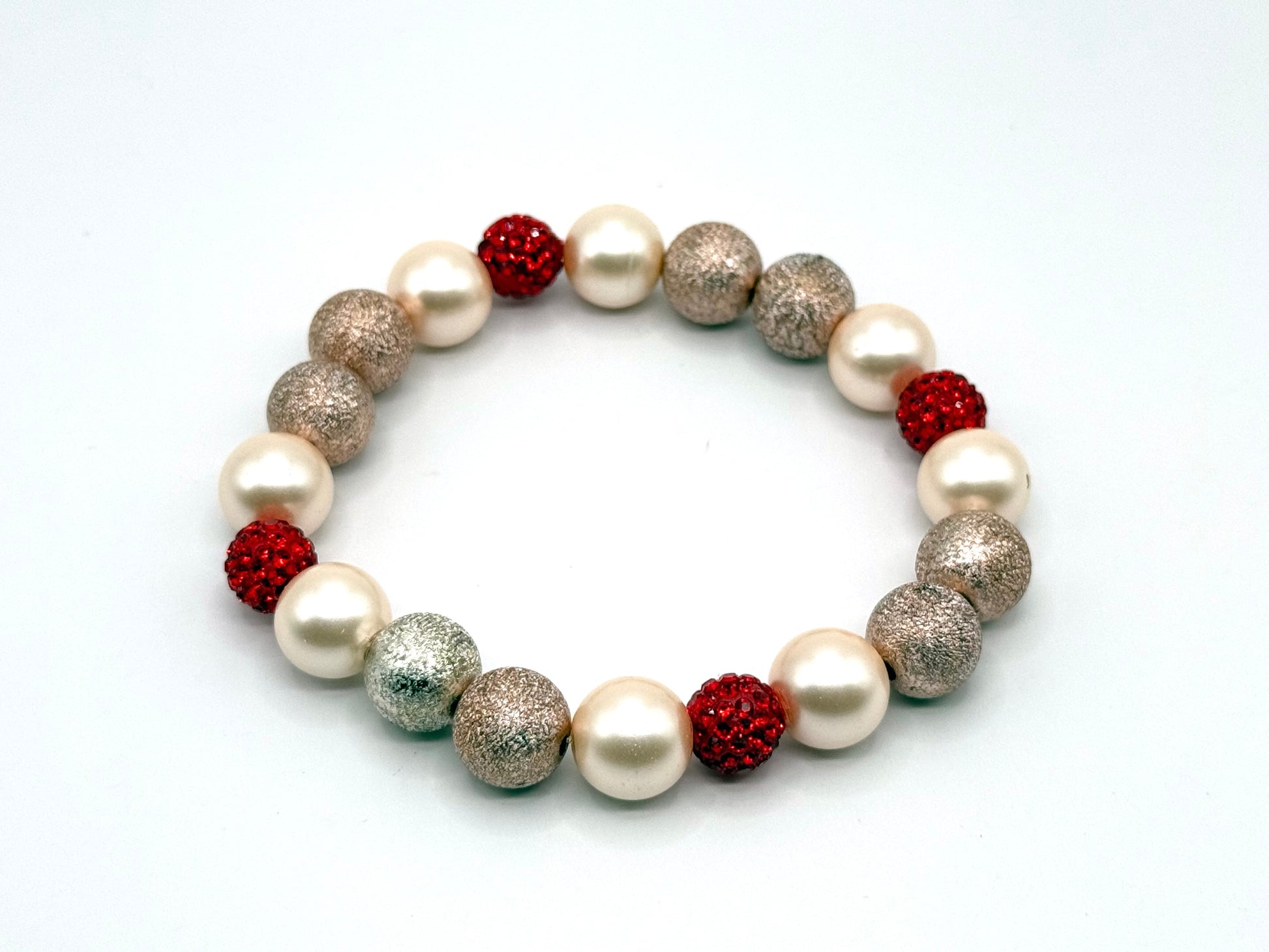 A sophisticated mix of pearly cream, radiant red, and shimmering gold-silver tones makes this stretch bracelet a true celebration of the season.