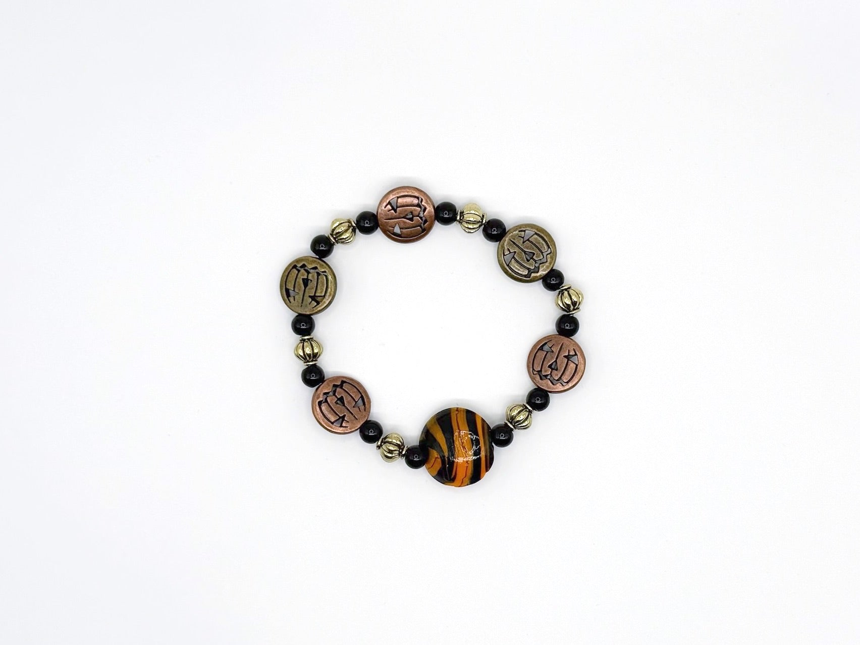 A sleek, minimalist take on Halloween icons — metallic pumpkin beads balanced with orange molten glass and glossy onyx for a clean finish.