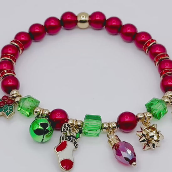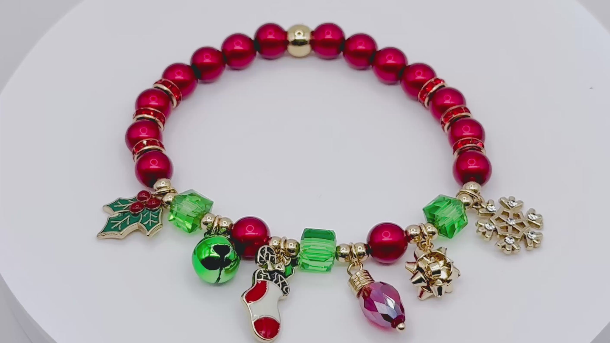 Classic Christmas tones meet delicate festive details in this charming design. With holly leaves, a stocking, and a glimmering snowflake, it’s the perfect finishing touch to any holiday outfit.