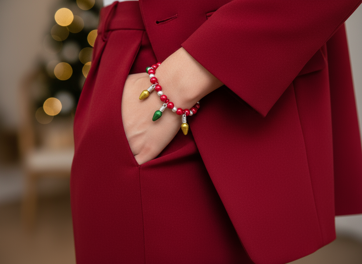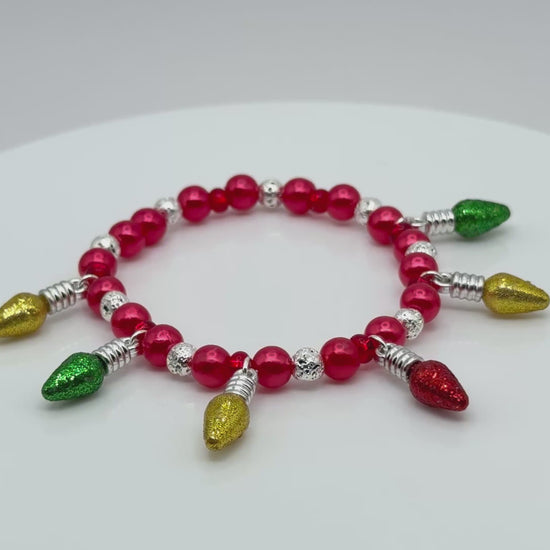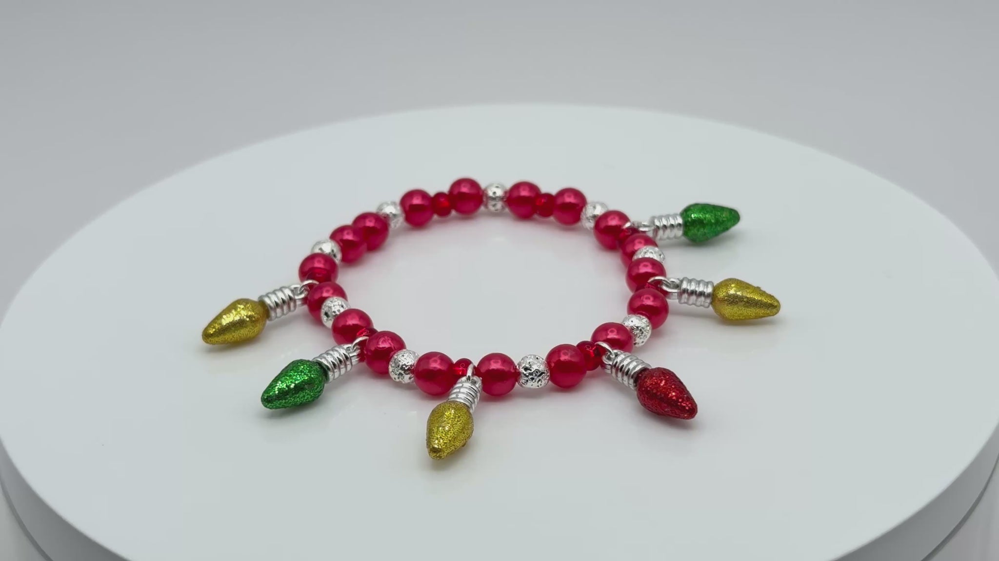 Bright red and shimmering silver beads set the stage for multicolored light charms on this playful stretch bracelet. A whimsical piece that celebrates the sparkle of the season.