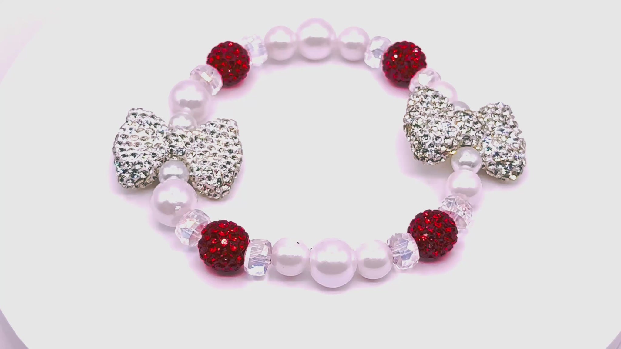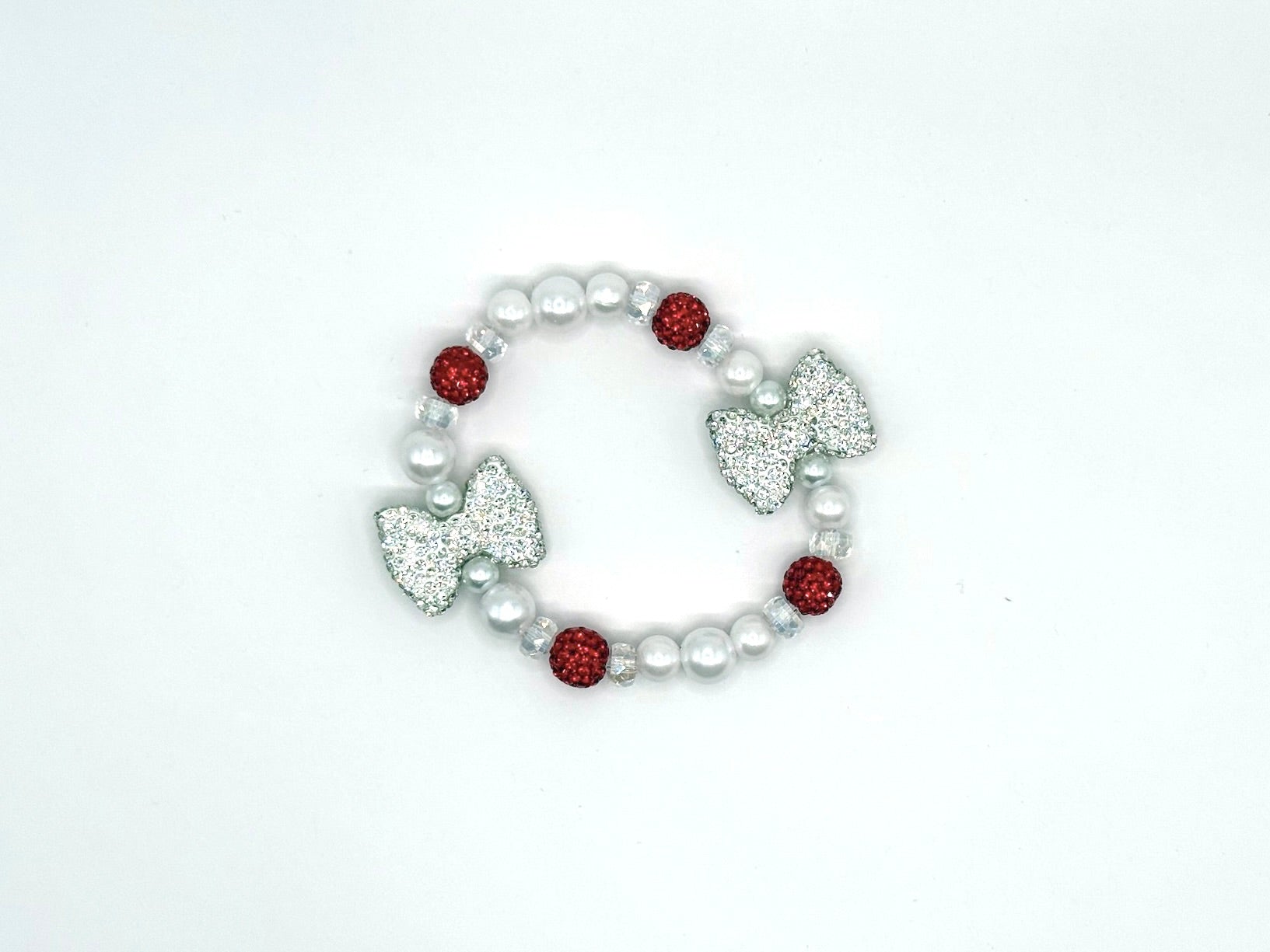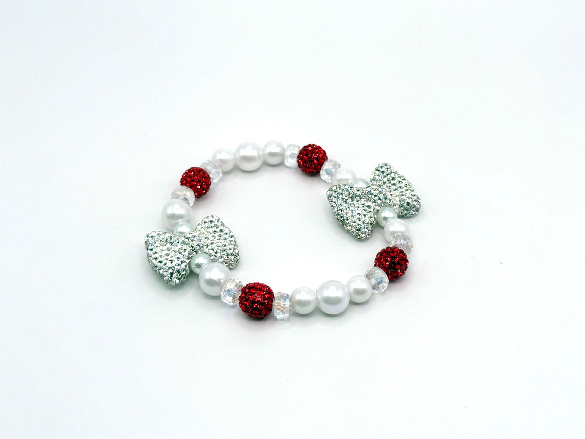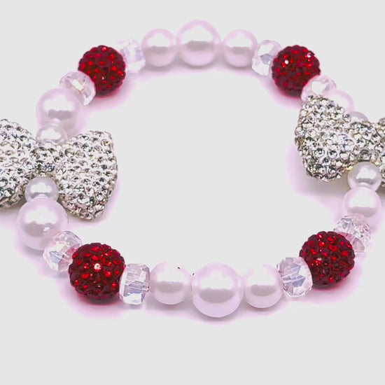 Shimmering pearls, radiant red accents, and glittering rhinestone bows come together for a bracelet that captures the joy and sparkle of the season.