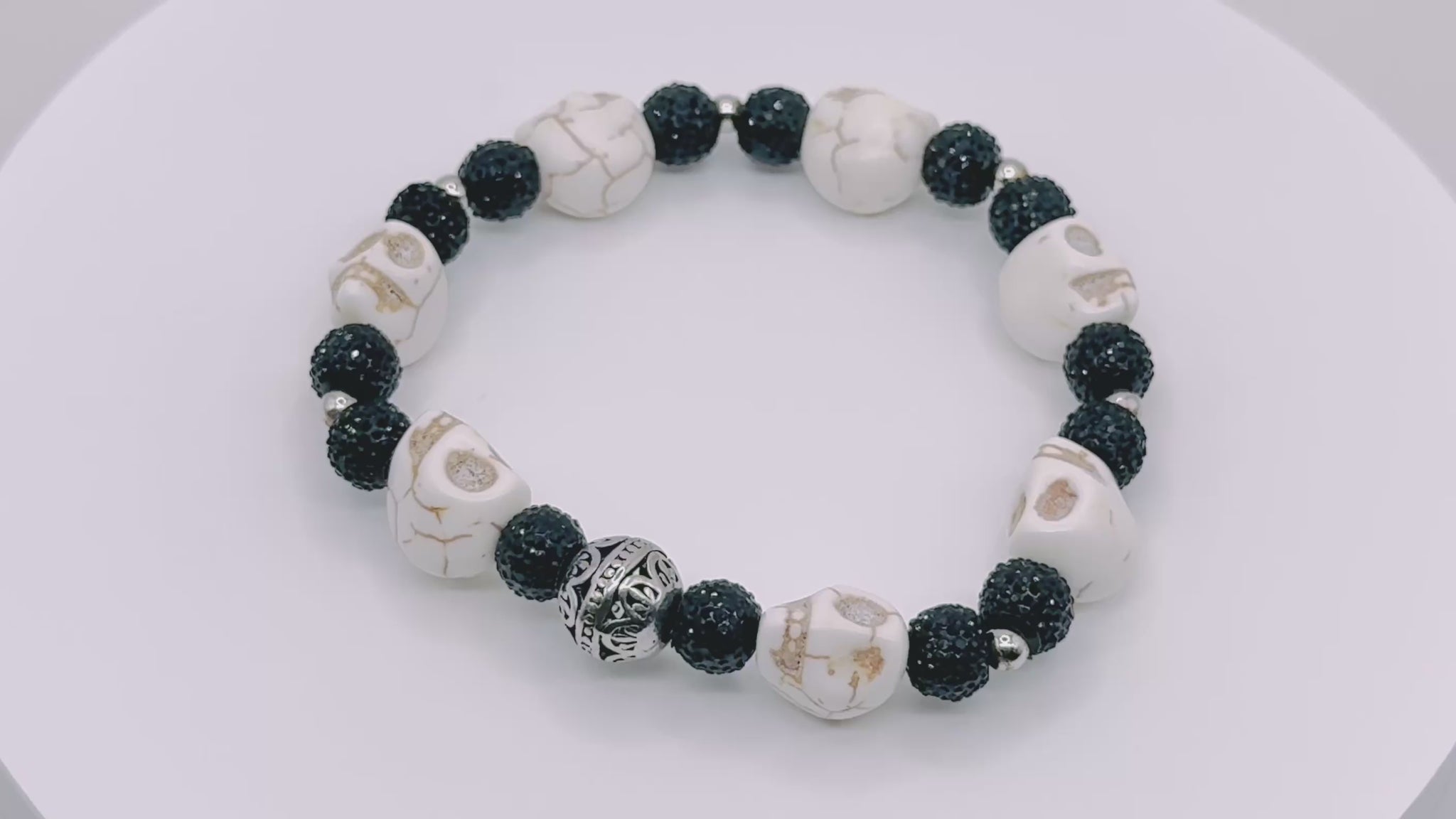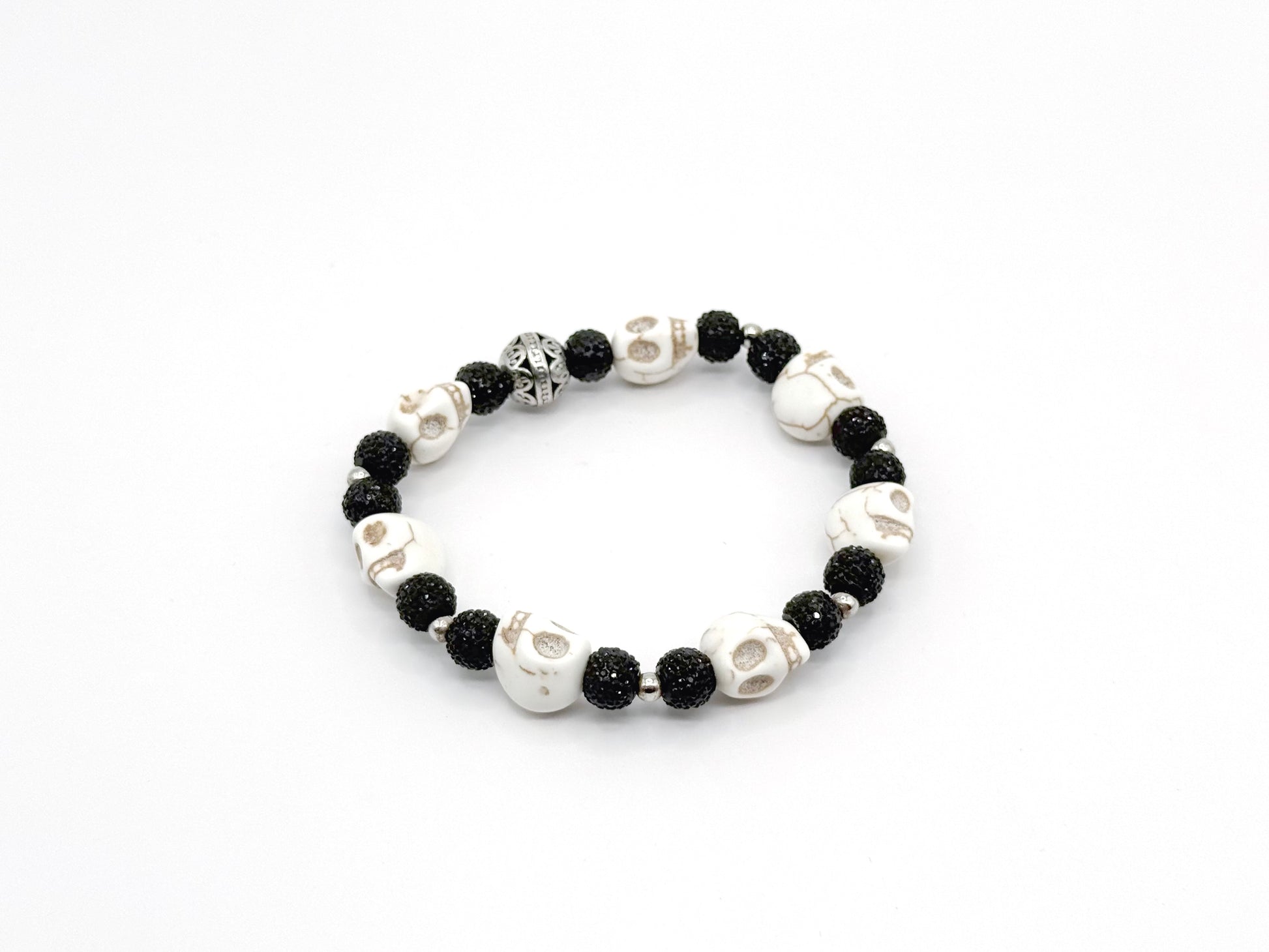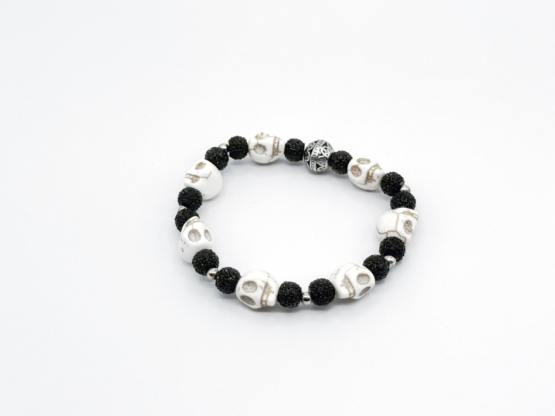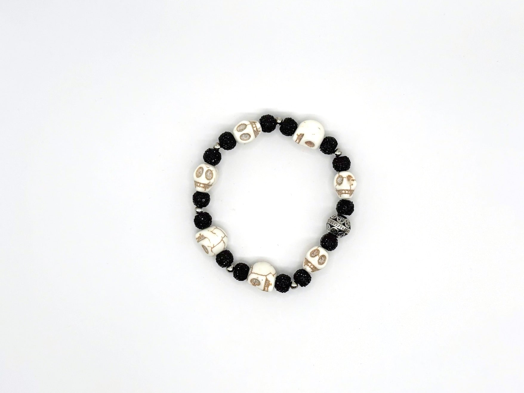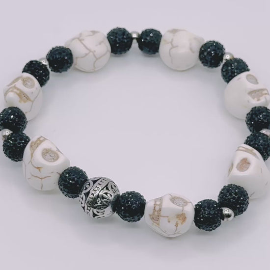 Classic black-and-white pairing reimagined with sculpted skulls and a single ornate metal focal bead.
