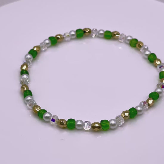 With green, gold, and frosty white beads, this stretch bracelet captures the sparkle of mistletoe on a snowy night. Playful, pretty, and full of holiday charm!