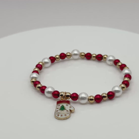 This playful stretch bracelet pairs frosty white and merry red beads with gold accents and a cute mitten charm — a cozy little reminder that the holidays are meant for fun and warmth.