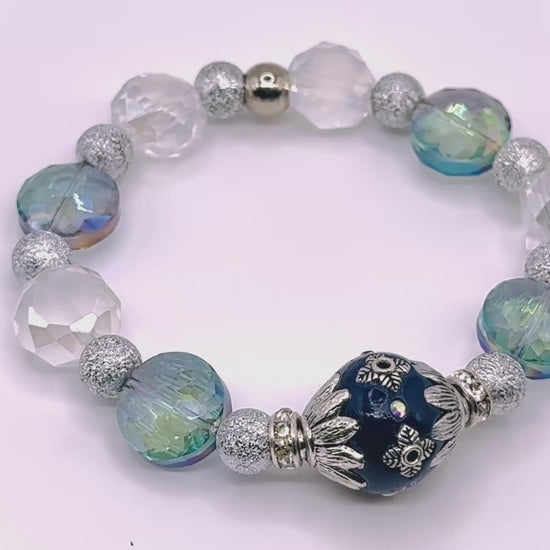 Faceted crystal beads glisten like morning frost around a hand-detailed floral accent, a piece that’s delicate, luminous, and endlessly elegant.