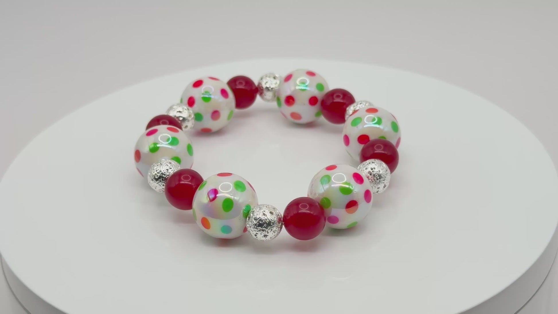 Bursting with red, green, and candy-colored polka dots, this playful stretch bracelet brings the sweet joy of the holidays to your wrist — festive, fun, and full of cheer!