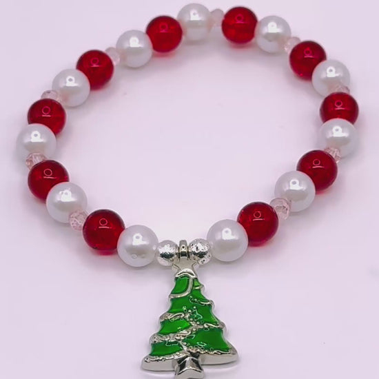 A timeless holiday piece featuring glossy red and pearl-white beads accented by a sparkling green tree charm. It’s playful yet elegant- perfect for gift-giving or pairing with your favorite festive outfit.