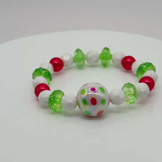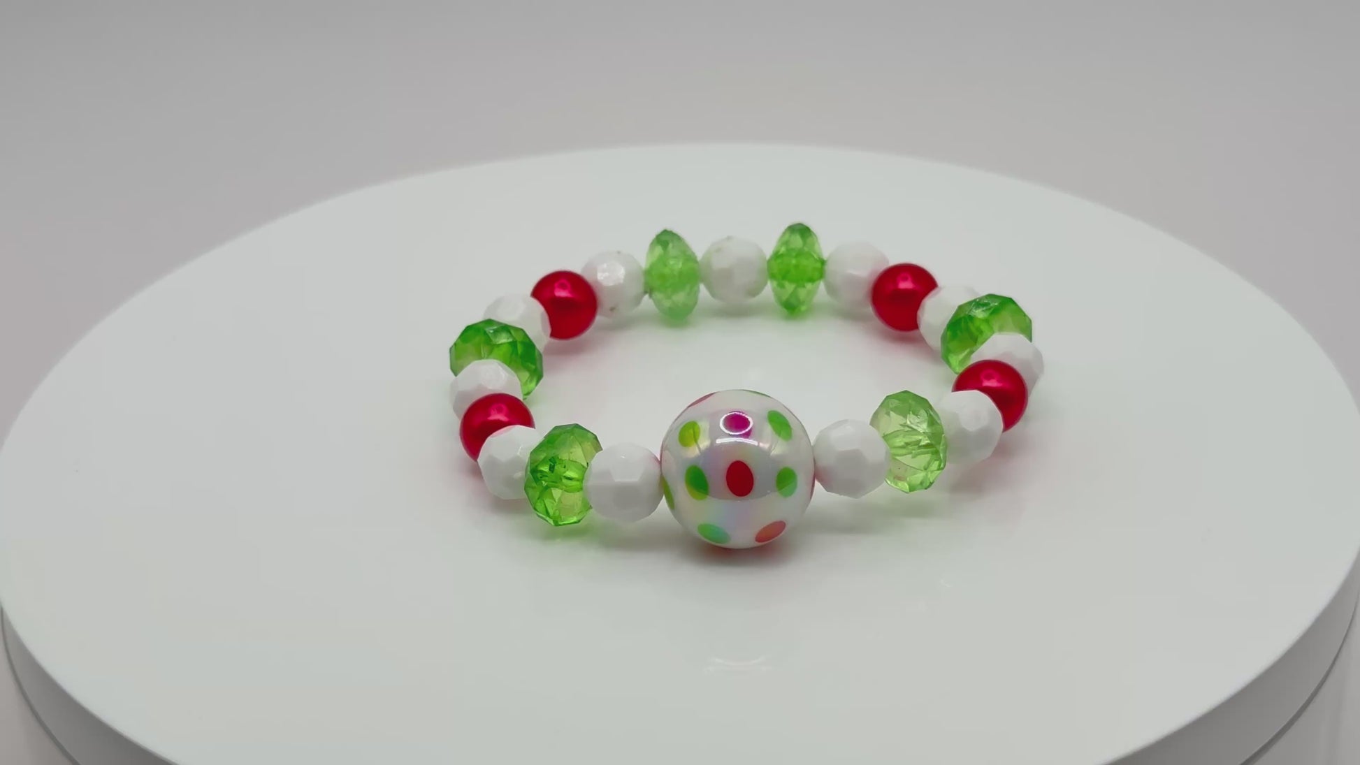 A swirl of candy-inspired red, white, and green beads gives this stretch bracelet a sweet, spirited look — perfect for the holiday season!