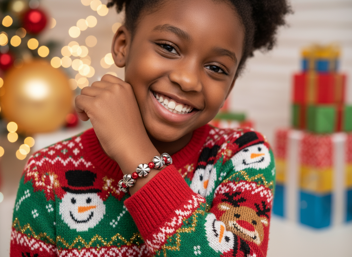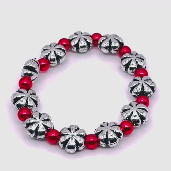 A merry mix of shiny silver and bright red beads that sparkle like a holiday candy swirl. Sweet, fun, and full of cheer!