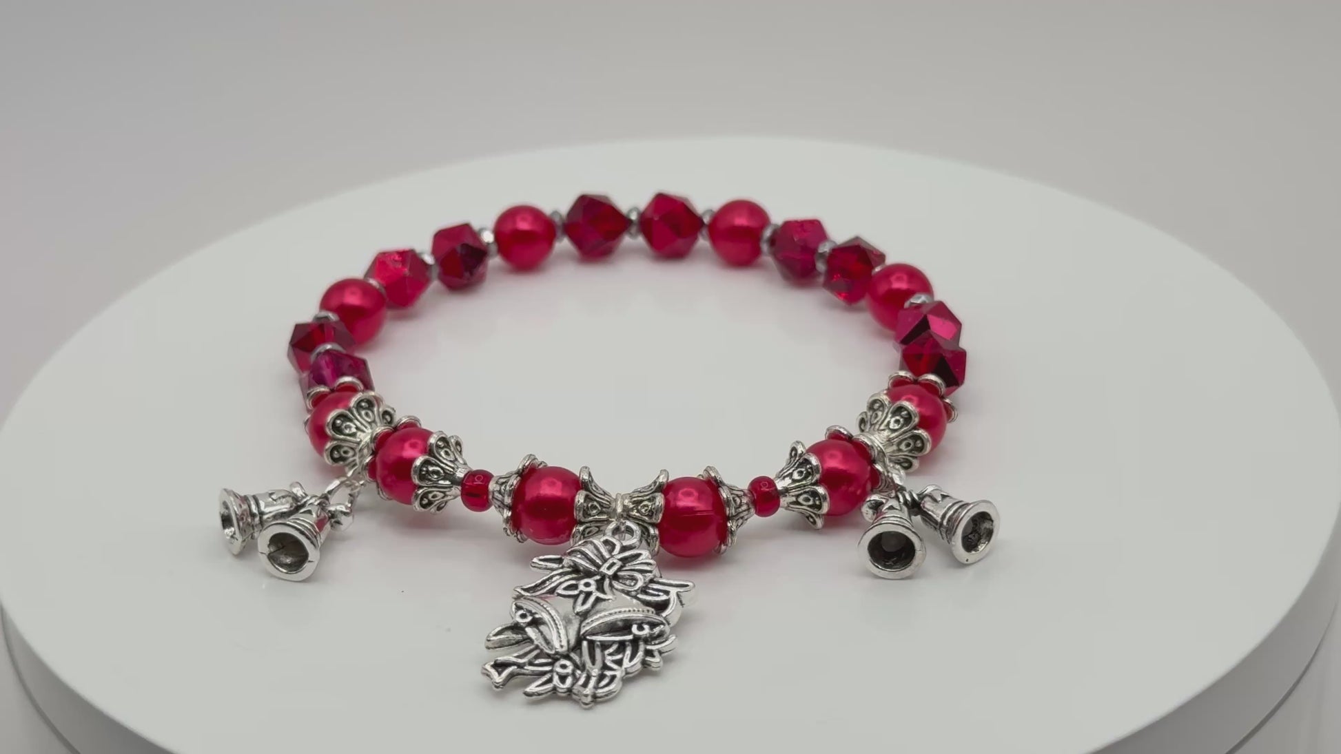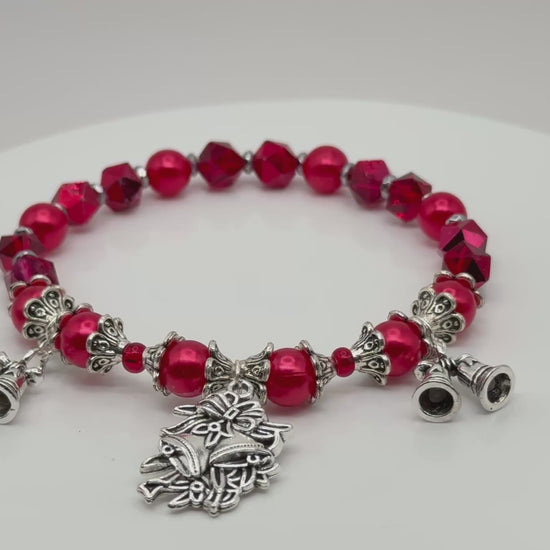 A celebration of sparkle and sound, this stretch bracelet pairs ruby-red shine with silver bells that jingle with every joyful moment.