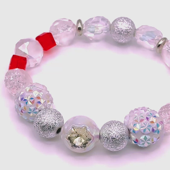 Elegant and radiant, this bracelet pairs deep red glass beads with touches of silver sparkle for a look that’s both fiery and frosted.
