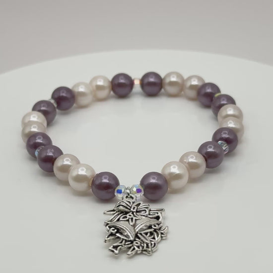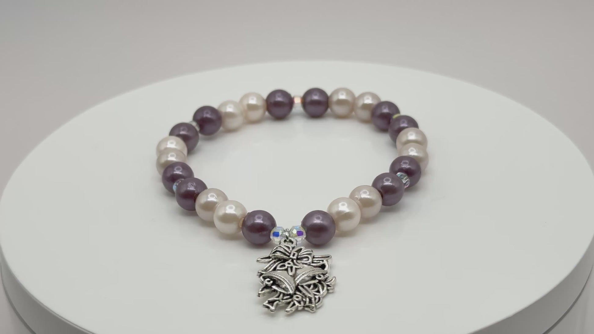 Inspired by the magic of the Nutcracker, this stretch bracelet features plum and ivory pearls with a silver bell charm that jingles with holiday charm. Sweet, elegant, and full of whimsy!
