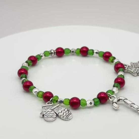 Bright, bold, and full of holiday joy — this stretch bracelet brings together candy canes, mittens, and merry colors for the ultimate festive accessory.