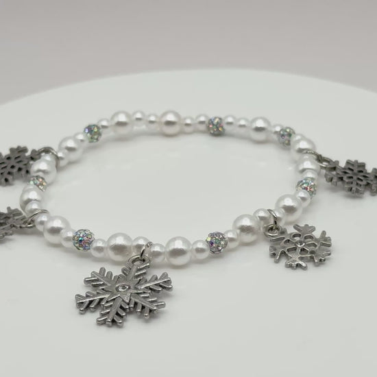 A merry mix of pearly white beads and glistening snowflake charms brings classic holiday nostalgia to this lovely stretch bracelet.