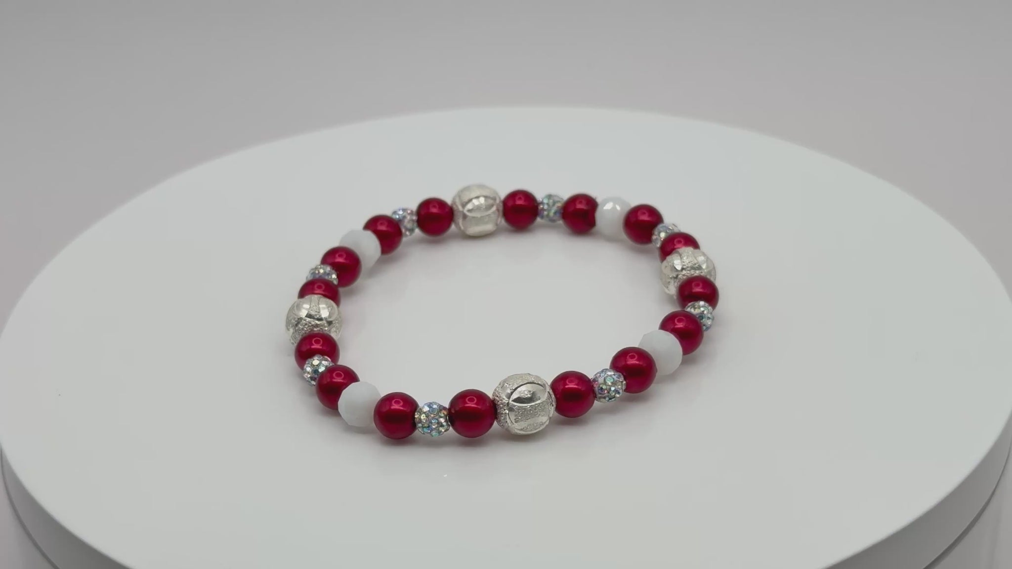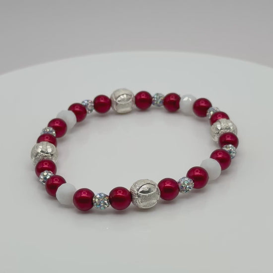 Frosty whites and festive reds come together in this graceful stretch bracelet, perfect for snowy strolls and cozy nights by the fire.